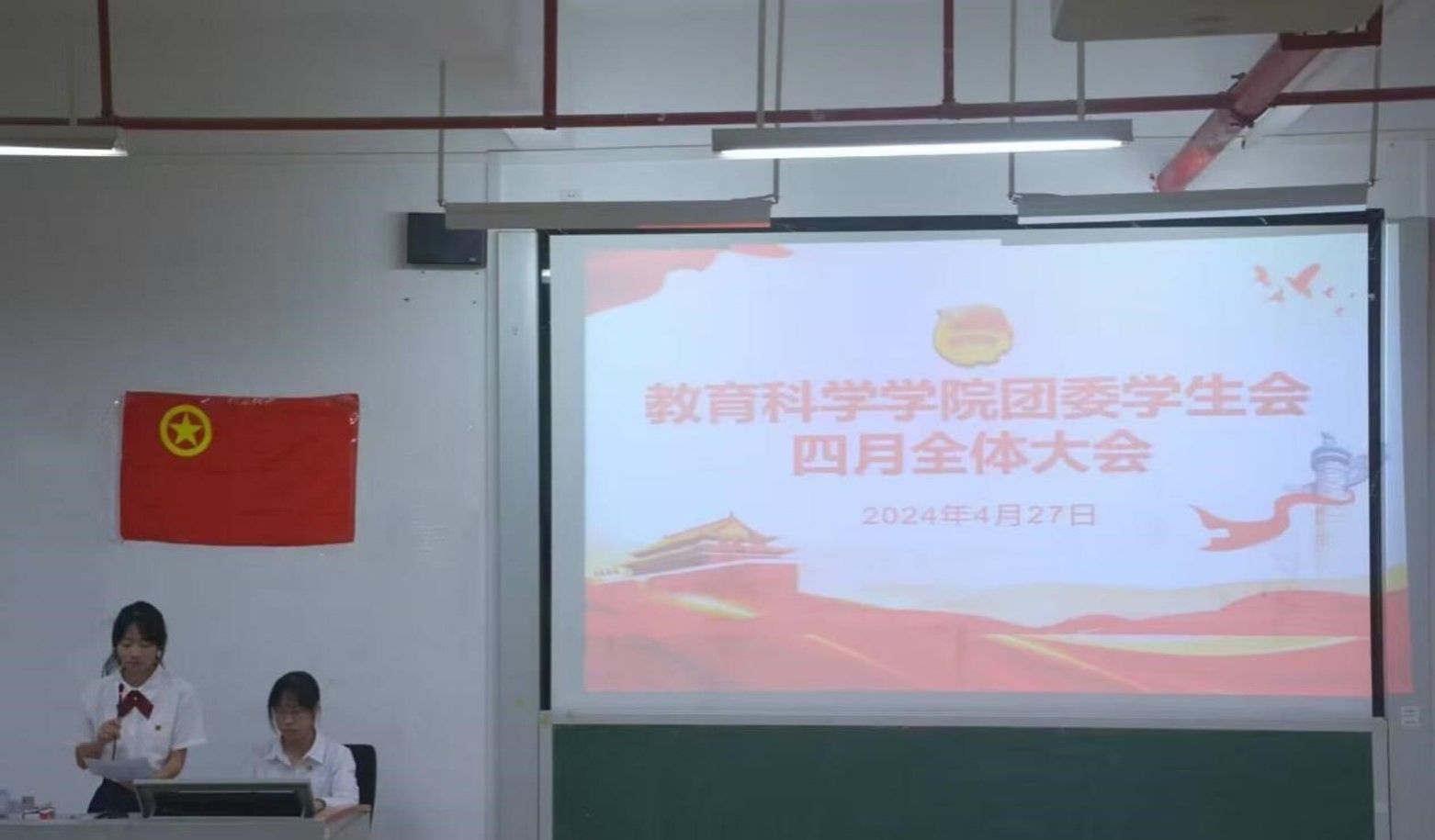 4月27日晚,教育科学学院团委学生会四月份全体大会在五合校区文综401教室举行,辅导员周敏波、兼职辅导员李逸颖、梁月怡,学院团委学生会各部门成员参会。