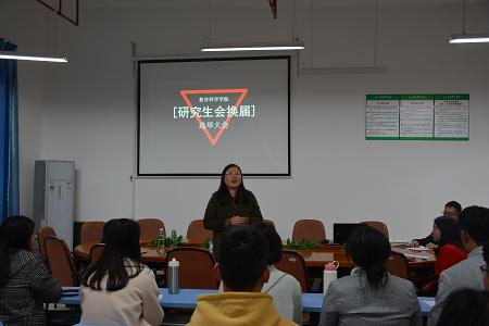 2018年1月2日,由教育科学学院研究生会主办的第十一届研究生换届大会在理综楼1003教室举行,出席此次换届大会的有张瑞副院长、敖方言副书记、周芳师姐及全体研会成员,会议由研会主席李天航主持。