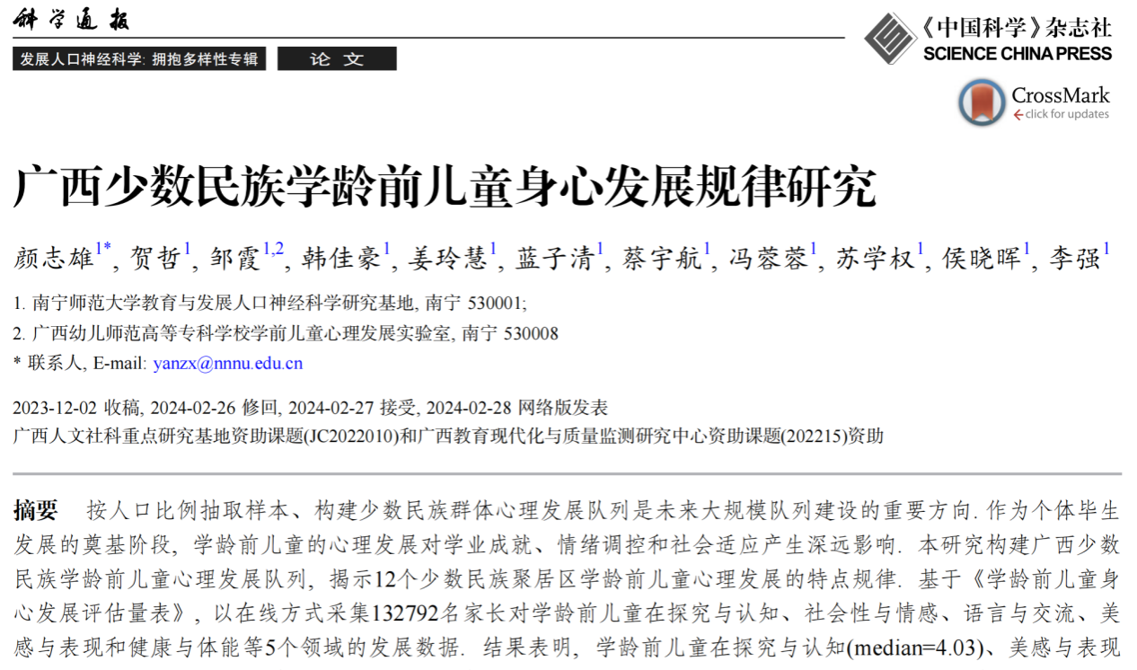 近日,我校教育科学学院颜志雄教授团队以南宁师范大学为第一署名单位在《科学通报》发展人口神经科学: 拥抱多样性专辑上发表题为“广西少数民族学龄前儿童身心发展规律研究”的研究论文。
