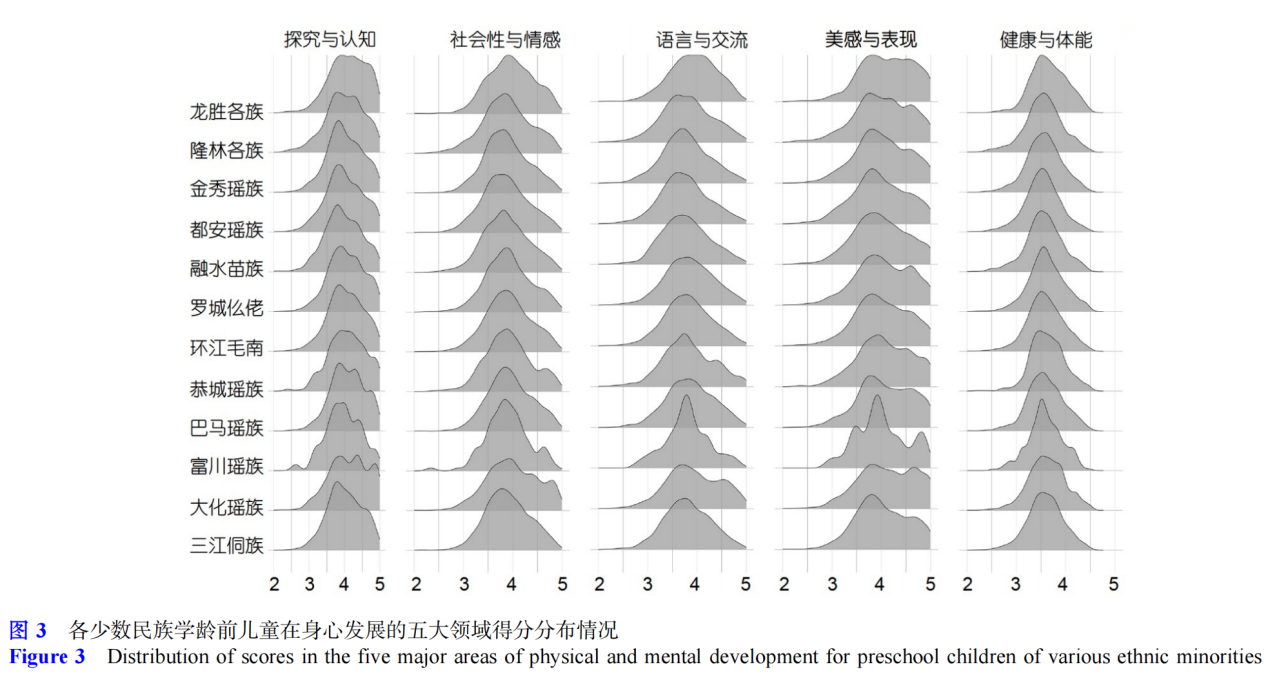 研究基于广西学龄前儿童身心发展大规模调研, 揭示12个少数民族聚居区学龄前儿童在探究与认知、社会性与情感、语言与交流、美感与表现和健康与体能等5个领域的身心发展差异特点。揭示广西各民族聚居区学龄前儿童身心发展的规律, 为构建少数民族学龄前儿童脑智发育队列积累前期基础, 将为制定契合少数民族学龄前儿童脑智发育特点的学前教育政策提供数据支撑。