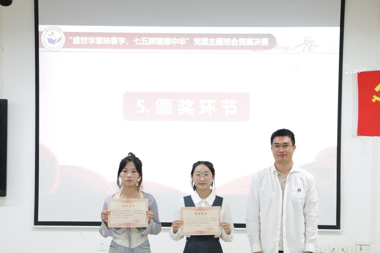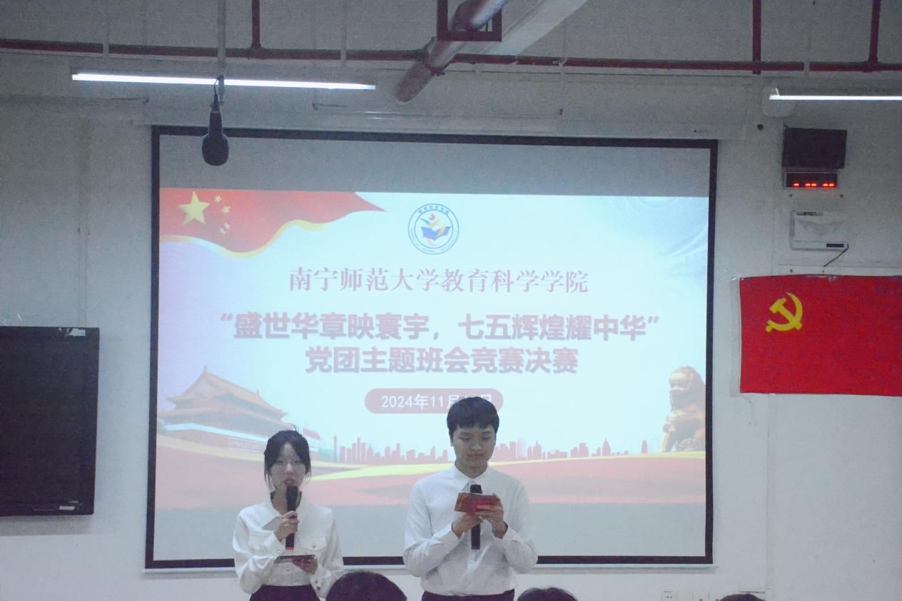 教育科学学院于11月13日晚在文综601举办“盛世华章映寰宇,七五辉煌耀中华”的党团主题班会决赛。团委书记蒋欢、辅导员郭恒、周芳和巫福星参加活动。