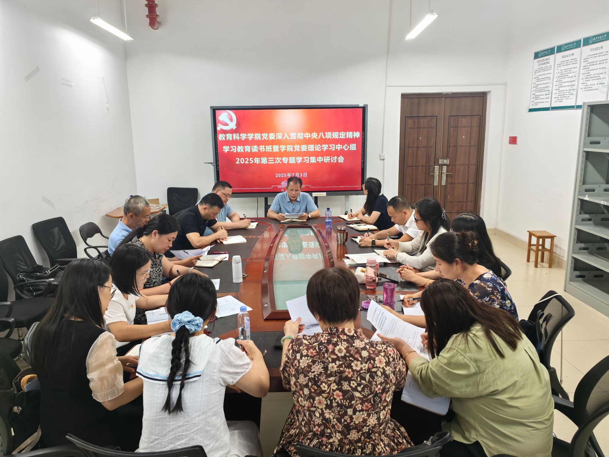 7月3日,教育科学学院党委在五合校区理综楼1004-1会议室召开深入贯彻中央八项规定精神学习教育读书班暨学院党委理论学习中心组2025年第三次专题学习集中研讨会。学院党委书记余朝文主持会议,学院党委理论学习中心组成员参加会议,学院纪委委员、各支部书记列席会议。