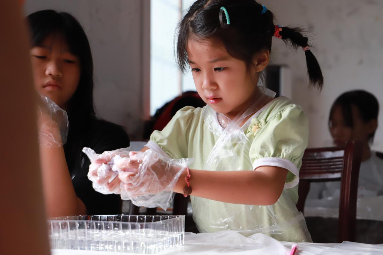 迎着清晨的阳光,天宝村及周围村落的25名学生陆续来到天宝村村委会议室参加夏令营活动。在非遗扎染体验手工课上,志愿者播放教学短片并进行现场示范后,为孩子们系上围兜、分发材料。折叠、扎结、浸染、拆线……当纯白的手帕与束口袋通过颜料晕染出独一无二的图案时,现场响起阵阵惊叹。石头绘画课上,实践队员支起小白板,让同学们在白板上设计要在石头上绘画的图案,再将鹅卵石、五颜六色的颜料、粗细不一的画笔等材料有序分发给每位同学。学生们专注地绘制着,以鹅卵石为画布,用画笔描绘自然与想象。