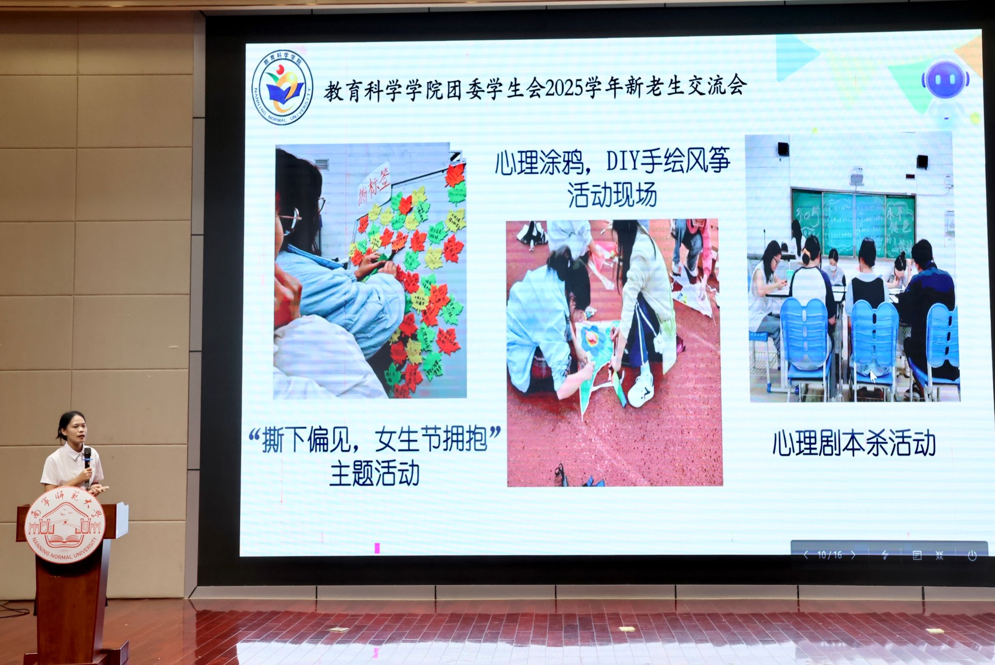 为了帮助新生融入校园生活,了解学院团委学生会部门和特色社团,教育科学学院于9月15日晚在五合校区文综114报告厅举办了2025年新老学生交流会。